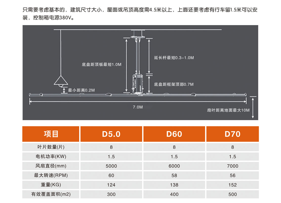大型工業(yè)吊扇直徑達5-7米,功率為1.5千瓦,風(fēng)力柔和、無噪音,能滿足200-500平方米的室內(nèi)降溫、通風(fēng)等要求。